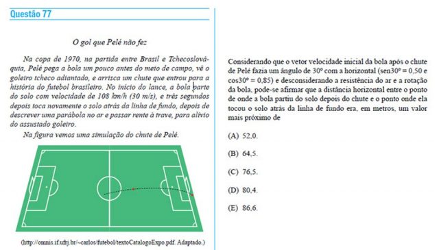 Veja, a seguir, exemplos de três questões de vestibular envolvendo lances de futebol (fictícios ou reais, incluindo o “gol que Pelé não fez”) e quais conhecimentos elas pediram (as respostas estão no fim da reportagem):