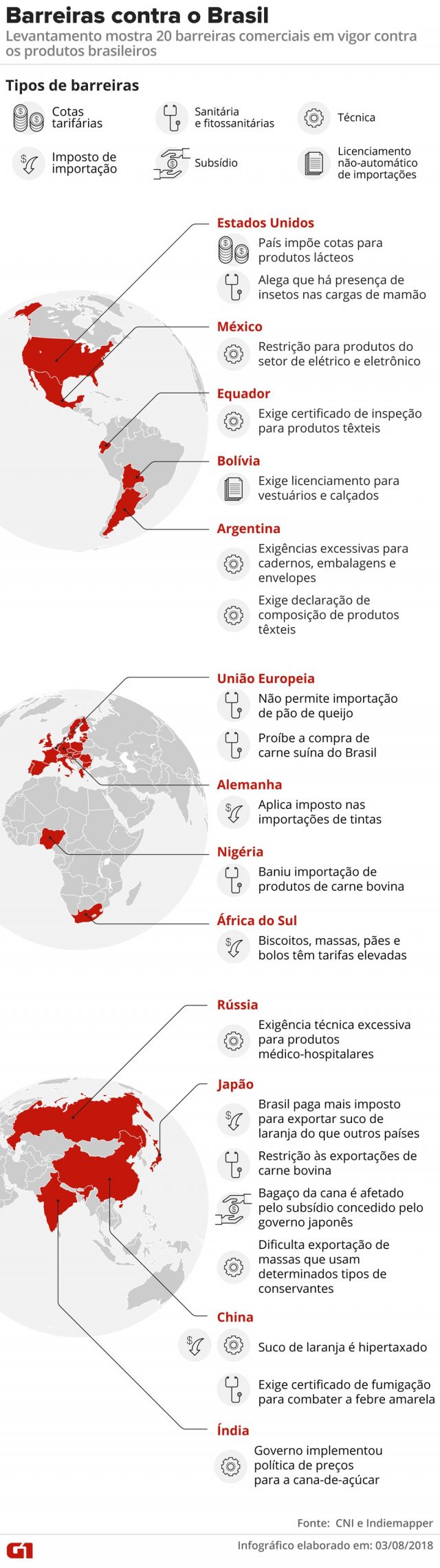 As barreiras são establecidas pelos países para dificultar a importação de produtos de outras economias ou podem aparecer na forma de subsídio, dando benefícios para as empresas locais. Contra o produto brasileiro, o estudo identificou barreiras sanitárias e técnicas, cotas tarifárias, concessão de subsídio, entre outras barreiras.