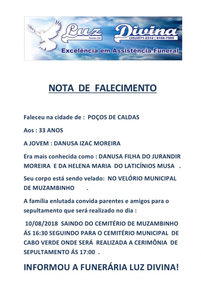 Mais Artigos AgronegócioDestaque Café em Foco, 11/03/26, Cotações e Informações da Cafeicultura DestaqueEventos e FestasParceiros Música ao vivo neste sábado no Bar do Edmar – Sagrada Família AgronegócioDestaqueParceiros Sicredi reforça protagonismo no agronegócio durante a FemagriDestaqueNossa CidadeObituárioFaleceu aos 33 anos Danusa Izac Moreira, velório e sepultamento… Redação10 de agosto de 20181min0Danusa, filha de Jurandir Moreira e Helena Maria do Laticínios Musa. Post Views: 2.126