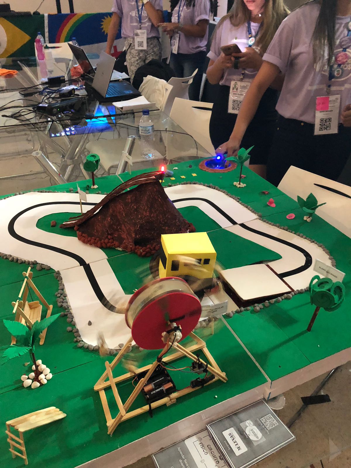 A equipe de Shéron criou um projeto na área de Física, um circuito dividido em quatro estações: do lago (que aborda conteúdos de densidade); da montanha (ensina sobre atrito); da roda gigante (que traz informações sobre movimento circular) e da ponte automática (que trata de força e direção). A proposta do protótipo era gerar conhecimento de forma lúdica, criando, em formato que lembra um jogo de tabuleiro, um percurso cheio de desafios que, para o estudante avançar, precisaria encontrar as respostas corretas. “O circuito pode ser montado pelo aluno ou pelo professor. Os desafios apresentados ao longo do percurso aproximam-se da realidade rotineira do aluno, demonstrando para ele que a física está em toda a parte. A ponte, o carrinho do percurso e a montanha-russa foram programados para que o circuito fosse mais interativo e pudesse chamar mais a atenção”, explica Shéron.