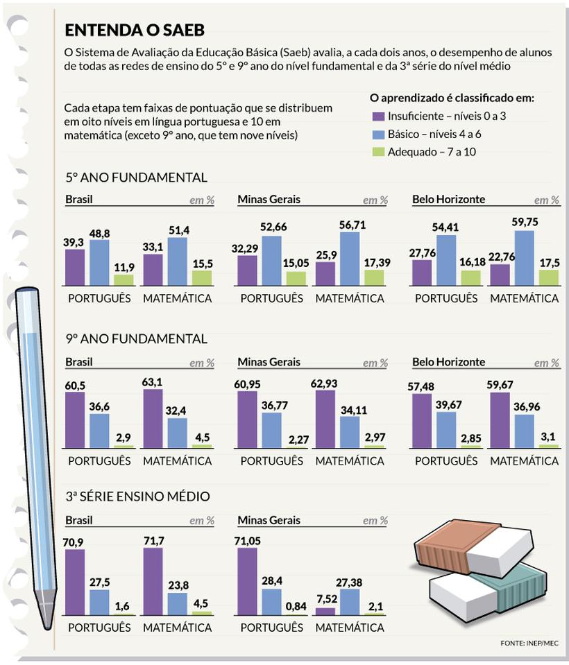 Mais de 5,4 milhões de estudantes do 5º e 9º ano do ensino fundamental, e da 3ª série do ensino médio, de mais de 70 mil escolas foram avaliados com testes de língua portuguesa e matemática. Também foram aplicados questionários para diretores, professores e estudantes. Em Minas Gerais, que tem desempenho superior à média nacional em todas as etapas avaliadas, 85% dos alunos do 5º anos têm conhecimento insuficiente ou básico em português e 82% deles, em matemática. Essa é a porcentagem também dos alunos da rede de Belo Horizonte que aprendem apenas até o básico os conteúdos da língua materna e aqueles relacionados aos números.