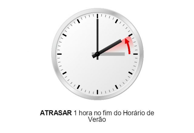 Quando o Horário de Verão chegar ao fim, os relógios devem ser ATRASADOS, ou seja, quando for 00h (meia-noite), a hora deve voltar para às 23h (11 horas da noite).