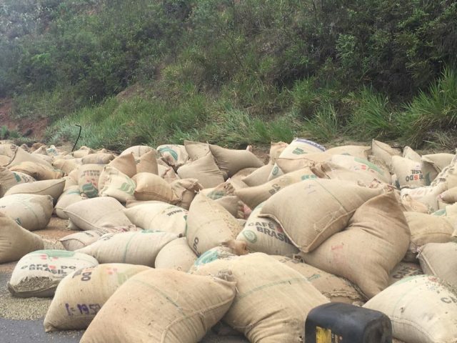 Uma carreta carregada de café tombou na rodovia BR-267, próximo a Campestre (MG), por volta das 16h desta terça-feira (13). A carga ficou espalhada pela pista. O motorista não teve ferimentos graves.