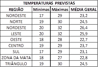 Apesar de não apresentar uma clara interferência nas precipitações, o El Niño traz um sinal claro de temperaturas acima da média. Em Minas, isso ocorrerá principalmente nas regiões Centro e Oeste, enquanto que nas demais localidades do estado as temperaturas tenderão a ficar dentro do esperado. Em relação aos meses, fevereiro será o mês mais frio, enquanto março, quando comparado a média do período, será o mês calor mais intenso.
