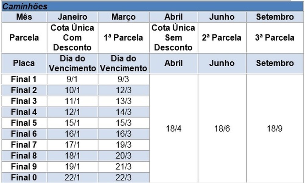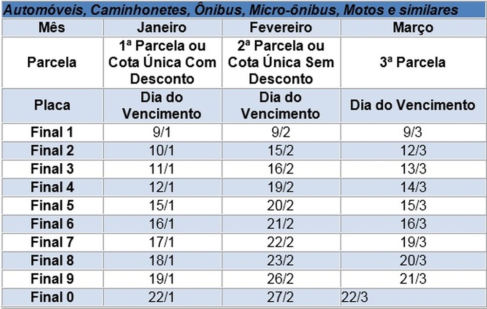 | Final de placa | Cota única/1ª parcela janeiro | 2ª parcela/fevereiro | 3ª parcela/março |