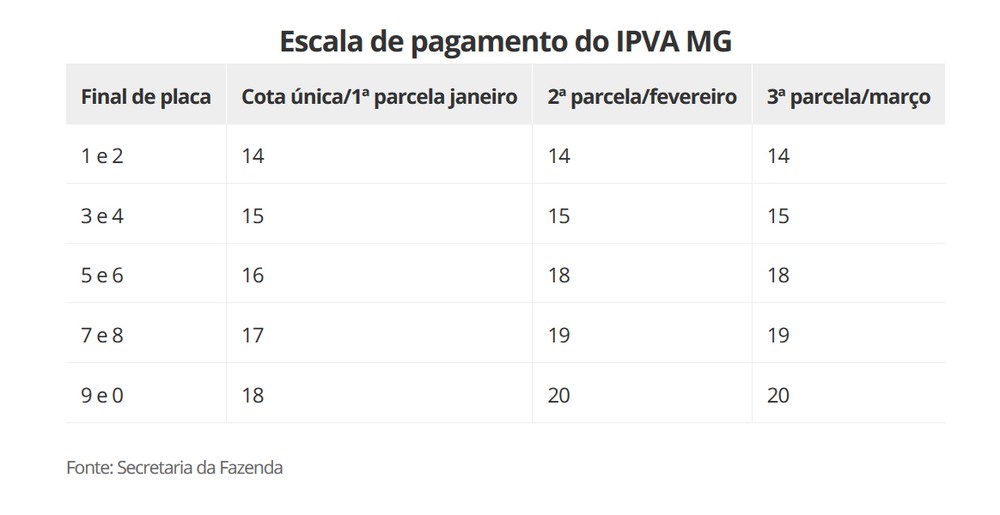 O Imposto sobre a Propriedade de Veículos Automotores (IPVA) começa a vencer no dia 14 de janeiro, para os carros com placas com finais 1 e 2 (veja tabela abaixo). Quem for pagar em parcela única terá desconto de 3%.