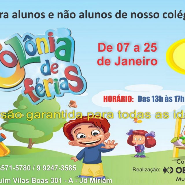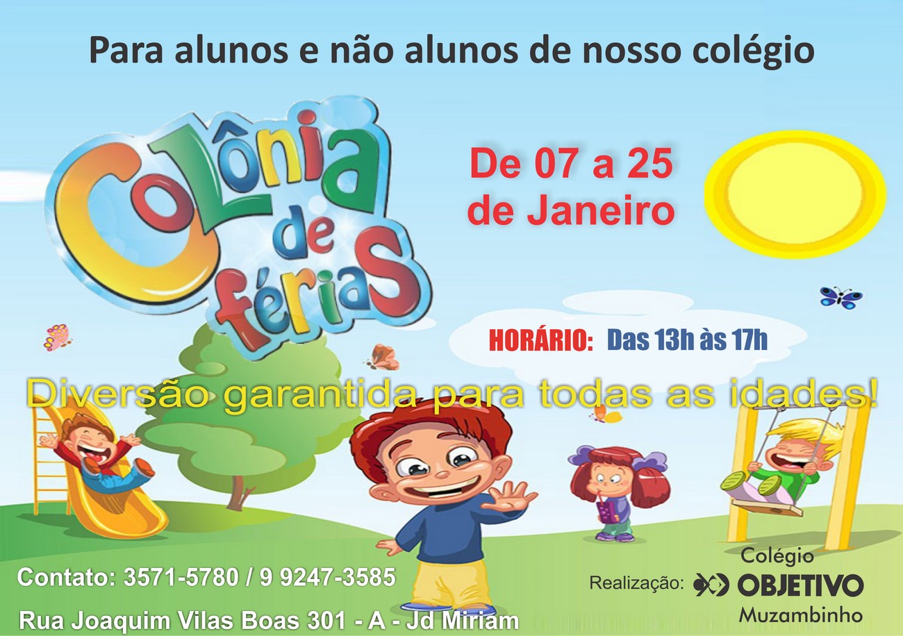 Atenção criançada, papai e mamãe… A tradicional colônia de férias do Colégio Objetivo vai começar. De 07 a 25 de Janeiro, para alunos e não alunos de nossa escola.