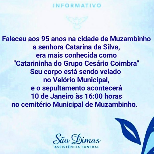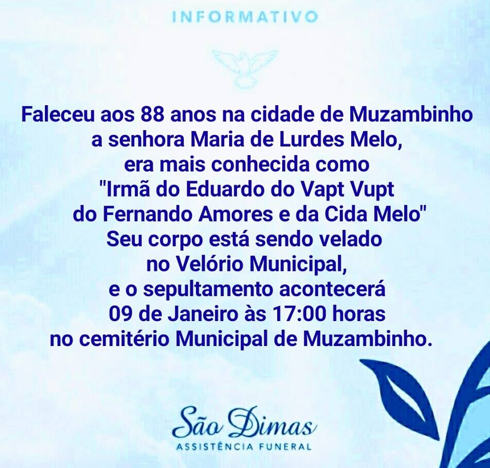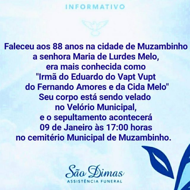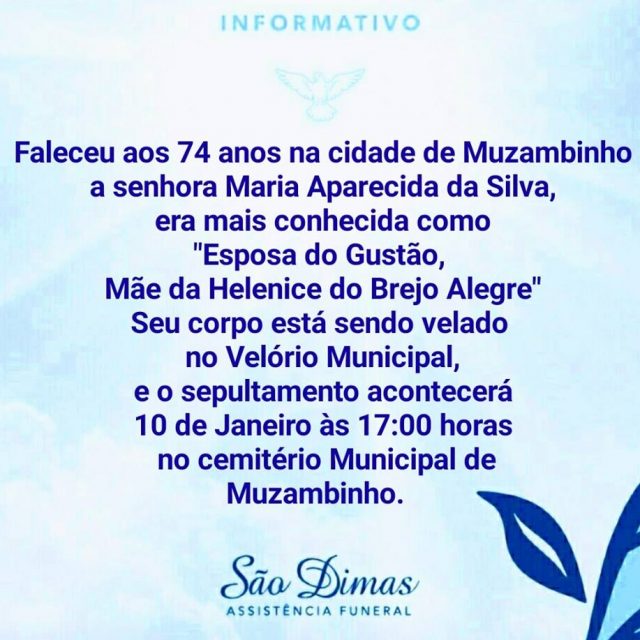 A Funerária São Dimas e o muzambinho.com, mesmo após os sepultamentos comunicam a população muzambinhense estes óbitos.