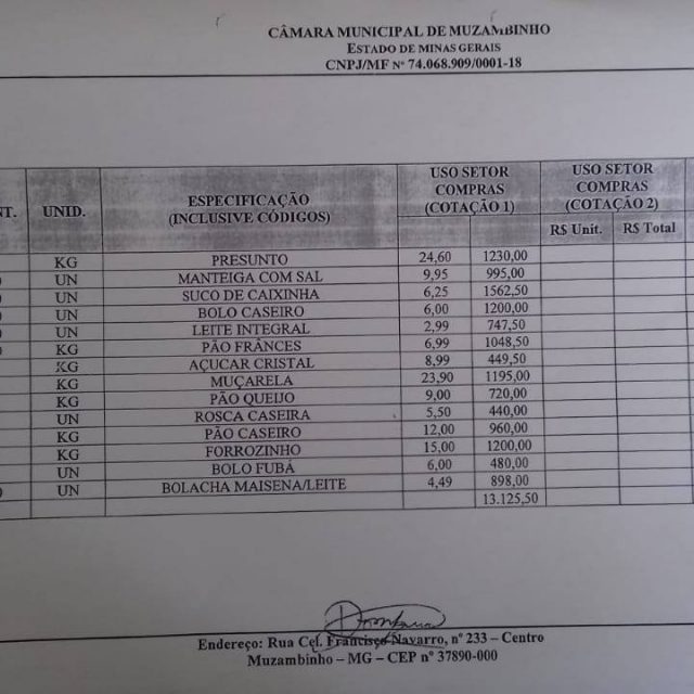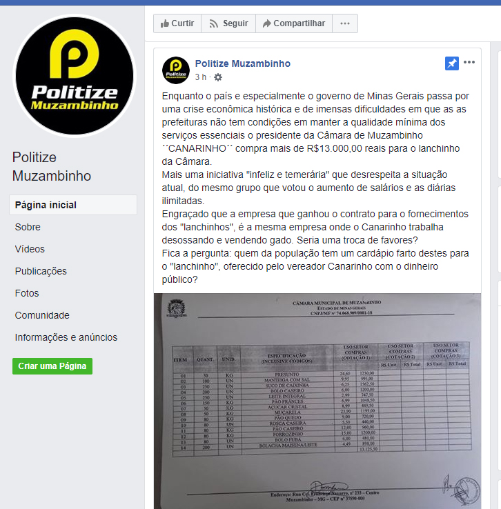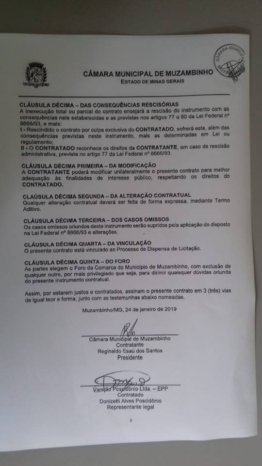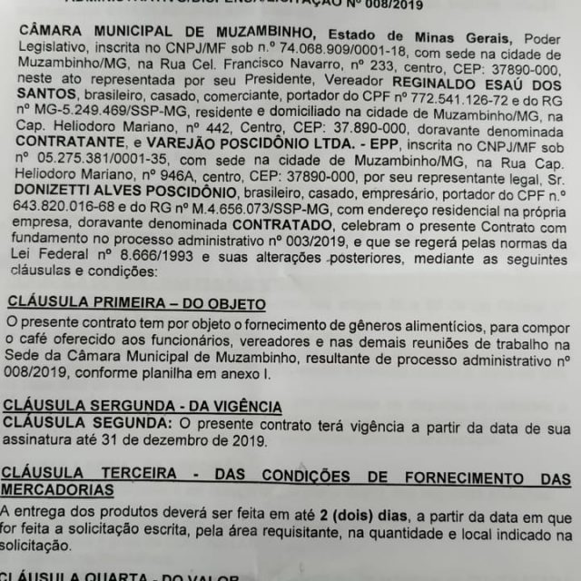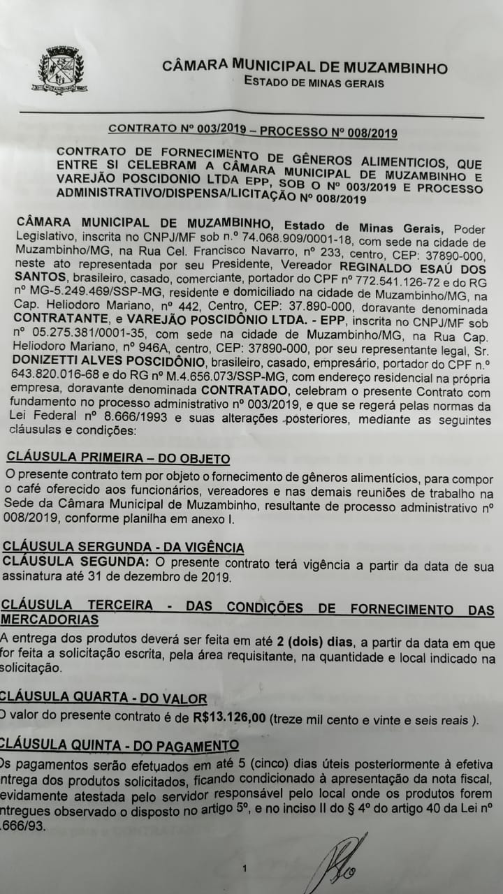 Foi publicado nesta segunda-feira na página “Politize Muzambinho” fotos do Contrato 03/19, que trata do fornecimento de Gêneros Alimentícios para o café oferecido aos funcionários e vereadores.