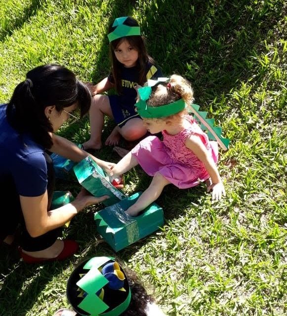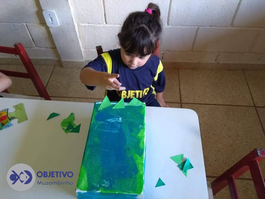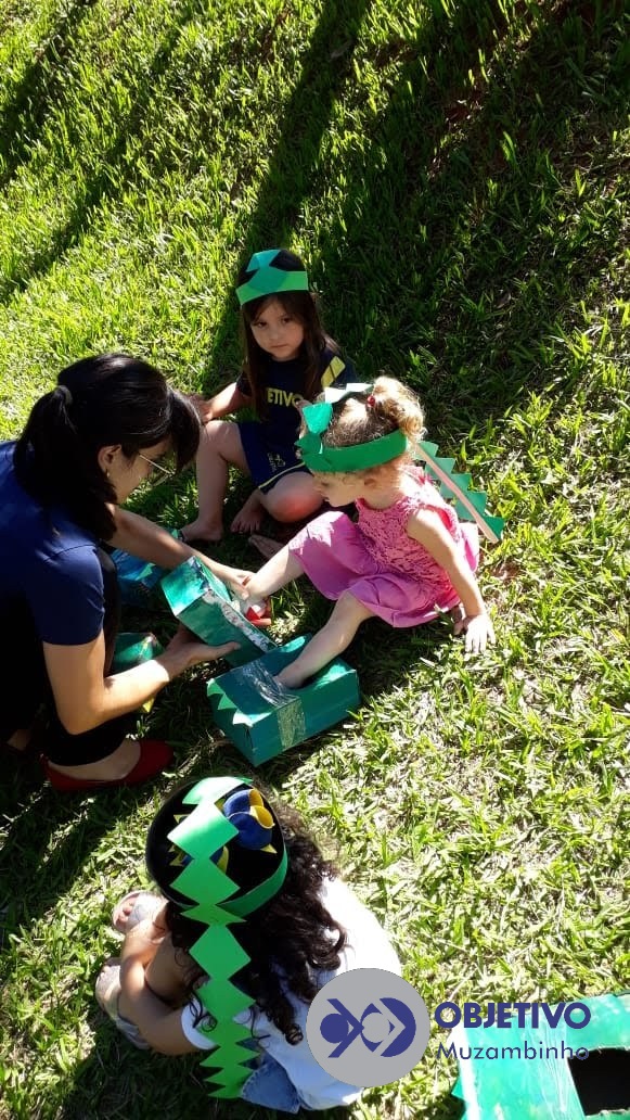No primeiro dia os alunos ouviram a história “Festa dos animais”, contada pelas professoras. Na sequencia confeccionaram massinha e trabalharam com comparações – pegada do dinossauro e pegadas na areia. Também desenvolveram atividades onde aprenderam sobre a medida de altura, explorando o animal girafa e fizeram comparações de sua medida com a medida dos colegas. Se divertiram até com a pintura da caixa de sapato para a confecção da pegada do dinossauro. Para concretizar o projeto brincaram até com as professoras no divertido passeio do dinossauro.