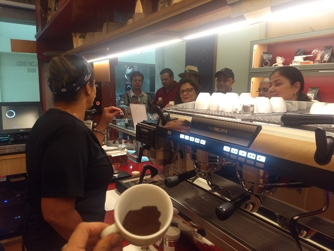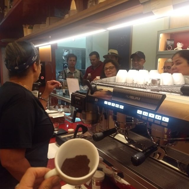 A primeira visita foi realizada na Onnie Café, e a barista da cafeteria Mara Araujo contou um pouco da importância da bebida que começa a ser comparada com o vinho enquanto o primeiro tem mais de séculos, o café, que tem pouco mais de 1.100 anos desde que passou a ter sua bebida preparada.