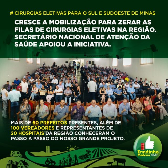 “Nós estamos muito satisfeitos, reunimos com quase todos os prestadores de serviço da nossa região, mais de 20 hospitais participaram, mais de 60 prefeitos, secretários de saúde e vários vereadores. Em 59 municípios, existem 18 mil cirurgias, segundo levantamento feito por nosso consultor, Tadeu da Saúde, que viajou a região toda, fazendo esse levantamento. Hoje nós sabemos qual especialidade, qual o procedimento de cada cidade. E com a vinda do Secretário Nacional de Atenção da Saúde, Francisco de Assis Figueiredo, a presença das Superintendentes Regionais da Saúde de Passos e Alfenas, Kátia e Thaís, nós estamos encurtando o caminho”, comemorou o deputado federal Emidinho Madeira.