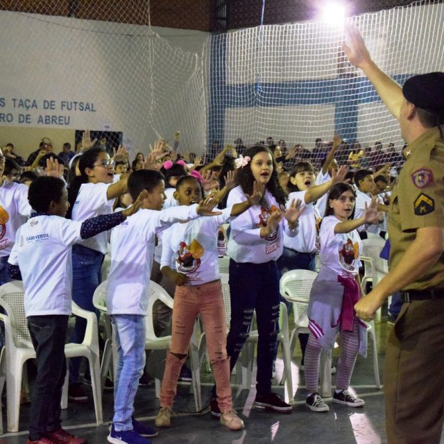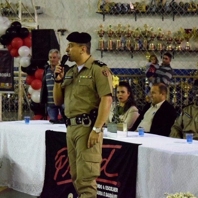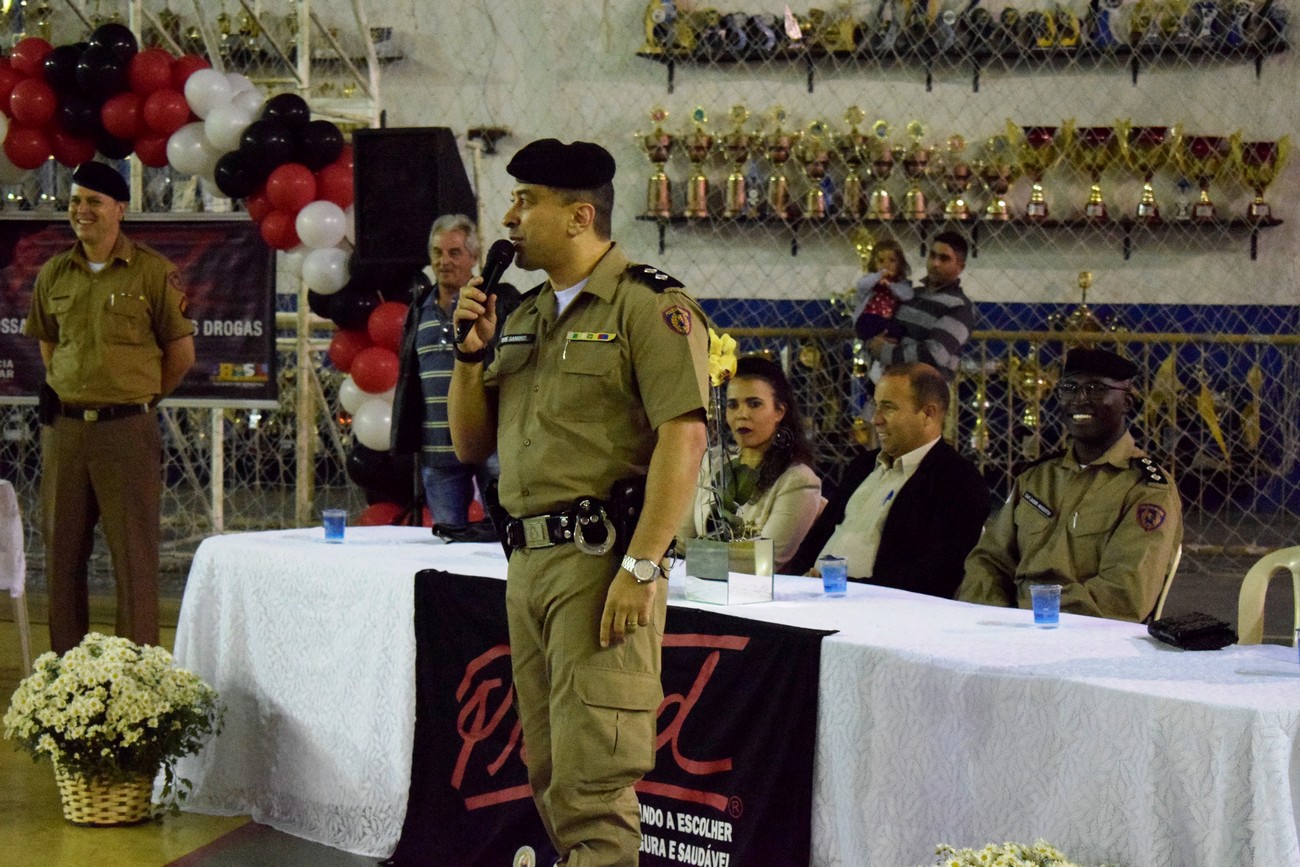 Encerrando a solenidade, os alunos fizeram o compromisso do PROERD: “de sempre ficarem longe das drogas” e entoaram a canção do PROERD.