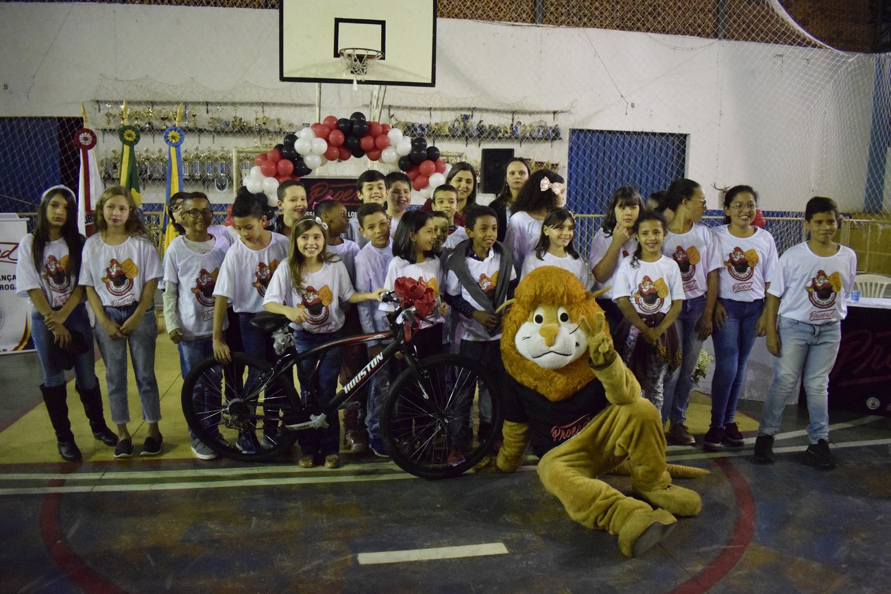 A aluna Ana Clara recebeu como premiação uma bicicleta, a qual foi entregue pelo 1º Ten Sandro, Cmt do 3º Pelotão PM e pela Sra. Stella Maris, Secretária Municipal de Educação.