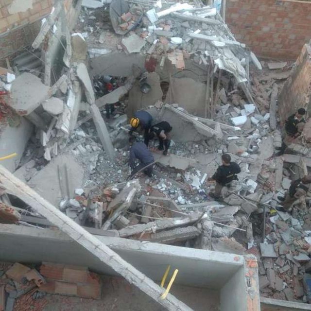Segundo o Corpo de Bombeiros, dois adultos estão presos sob os escombros do imóvel