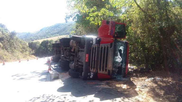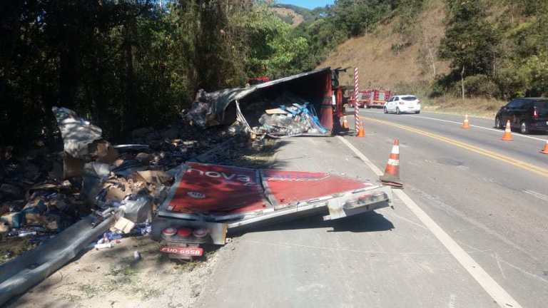A carreta transportava uma carga de desodorantes em aerosol. O Corpo de Bombeiros foi acionado para conter o risco de incêndio no local.