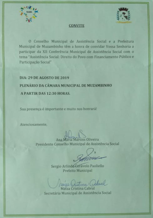 Mais Artigos Diversos Aposentados e pensionistas de Minas Gerais já receberam de volta mais de R$ 272,9 milhões por descontos não autorizados DestaqueEventos e FestasNossa CidadeParceiros ObaOba Samba House agita o Sagrada Família – Bar do Edmar no dia 20 de dezembro AgronegócioDestaqueEconomia Exportação de café do Brasil totaliza 36,9 milhões de sacas em 2025DestaqueDiversosNossa CidadeConferência Municipal de Assistência Social em Muzambinho Redação29 de agosto de 20191min0Dia 29 de Agosto de 2019 a partir das 12:30h Post Views: 1.012assistênciacâmara municipalMuzambinhoPrefeituraSocial