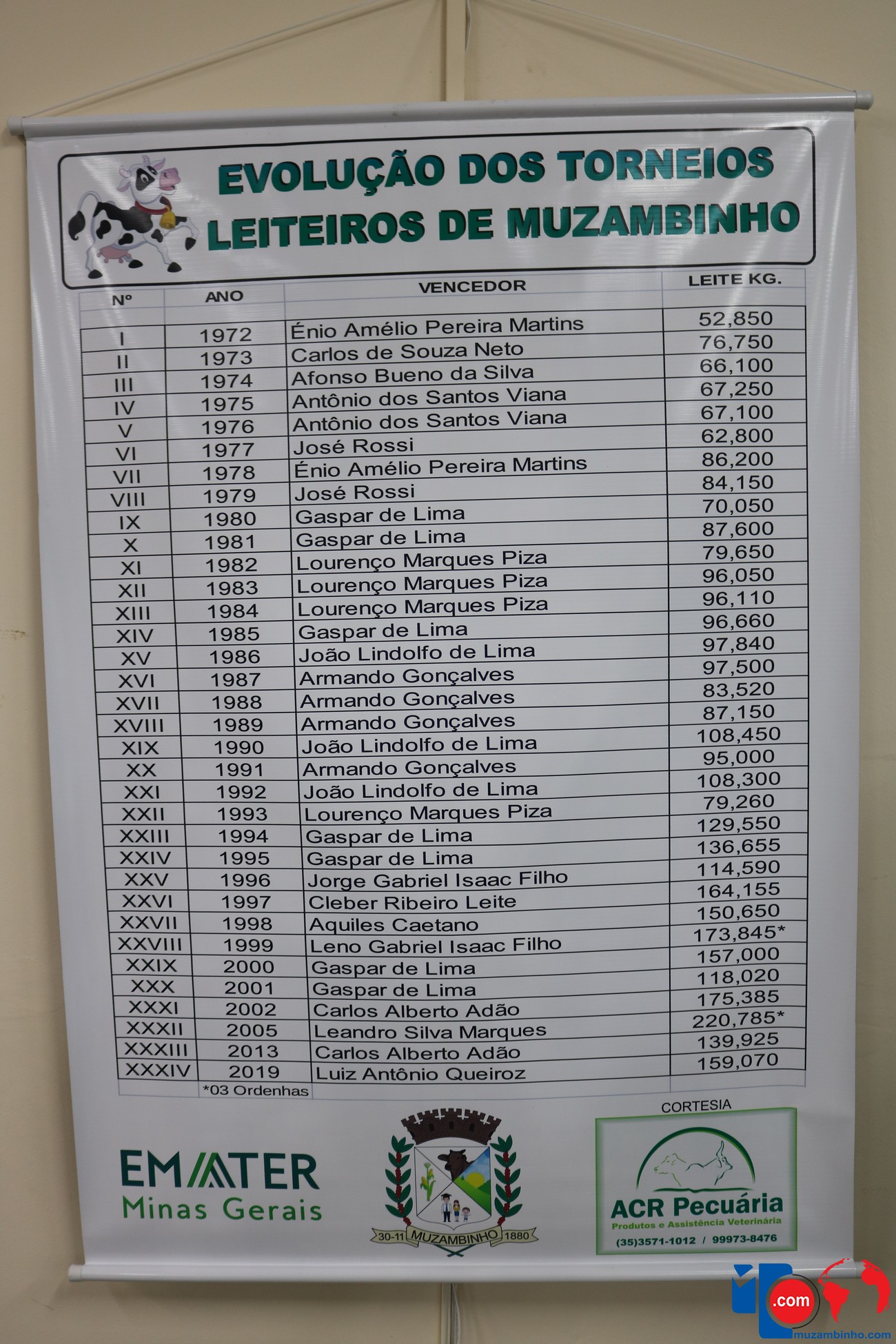 Neste sábado, 14/09, aconteceu o encerramento da XXXIV edição do Torneio Leiteiro realizado em nossa cidade, que contou com a participação de diversos produtores, todos muito bem sucedidos nas ordenhas realizadas, e o produtor campeão desta edição de 2019, foi o Sr. Luiz Antônio Queiroz que atingiu os 159,070Kg/leite nas duas ordenhas, com suas três melhores vacas produtoras de leite.