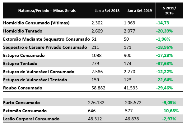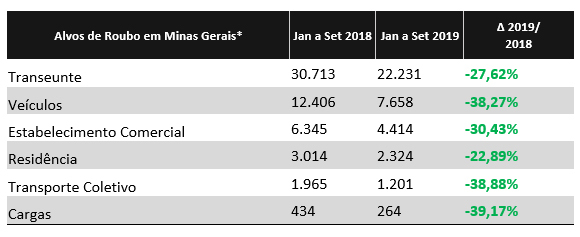 Chama a atenção a diminuição do número de roubos, que chega a quase 30%, com 17.349 registros de ocorrências a menos entre janeiro e setembro deste ano, frente ao mesmo período de 2018. Na prática, isso significa 48 roubos a menos no estado por dia, nos nove primeiros meses de 2019.