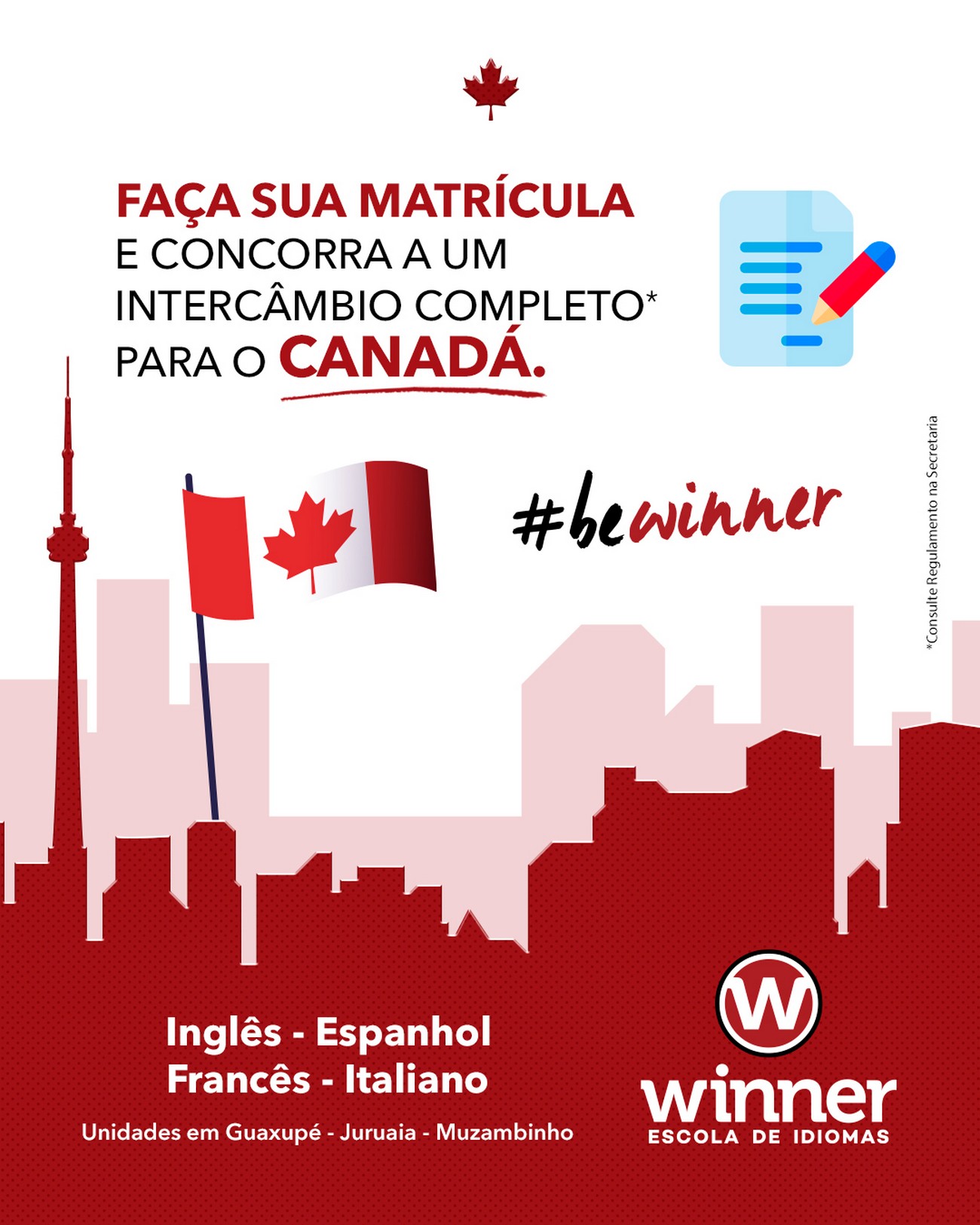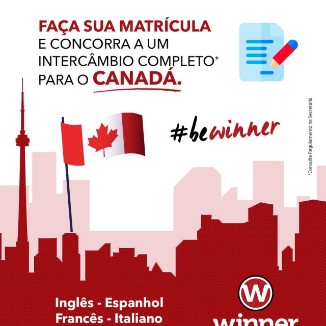 É sabido que uma experiência internacional pode trazer grandes benefícios e enriquecimento profissional e pessoal, sem falar na realização de um sonho estudantil em vivenciar a prática da língua estudada em sala de aula, e é por isso que iremos sortear aos alunos Winner, em 2020, Intercâmbio Completo para Toronto/Canadá com estudos em escola internacional, estadia em casa de família e alimentação inclusa.