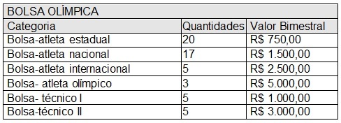 Bolsa Técnico: tem duas categorias. Bolsa- técnico I é para técnicos de atletas com resultados em competições estaduais e Bolsa-técnico II, para técnicos de atletas com resultados nas demais categorias.