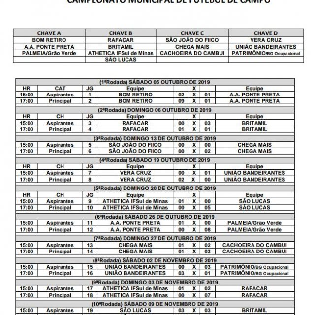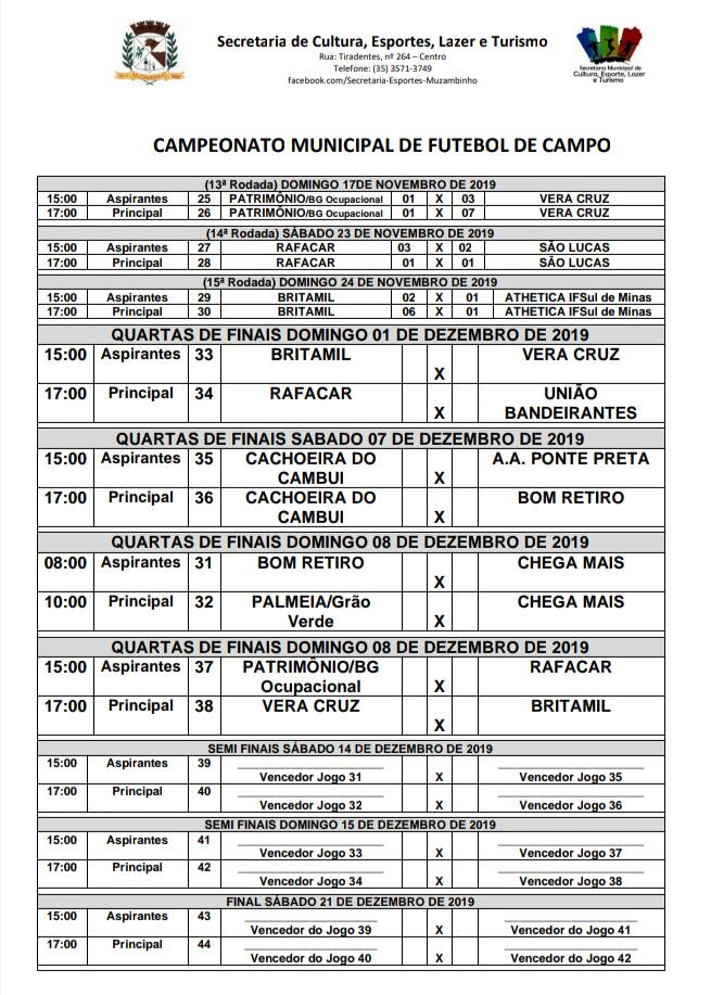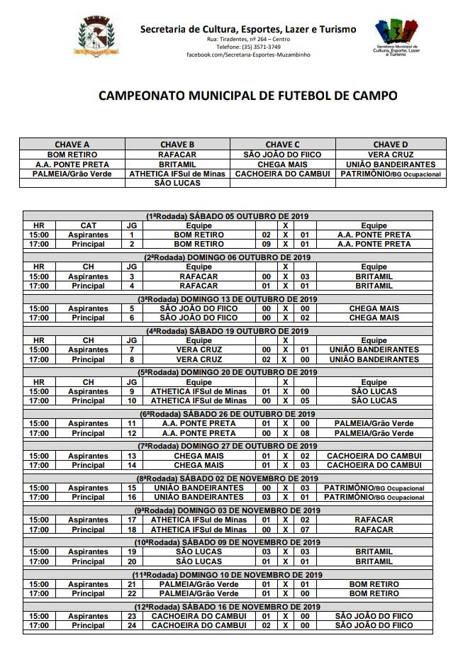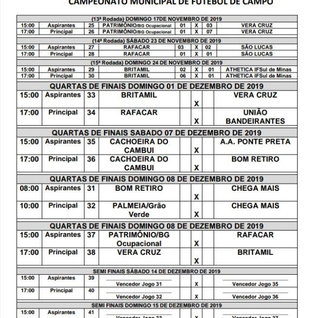 Mais Artigos DestaqueEventos e FestasNossa CidadeParceiros ObaOba Samba House agita o Sagrada Família – Bar do Edmar no dia 20 de dezembro AgronegócioDestaqueEconomia Exportação de café do Brasil totaliza 36,9 milhões de sacas em 2025 DestaqueEducaçãoNossa CidadeParceiros Encerramento Letivo 2025 do Colégio Lyceu emociona público com apresentações dos alunosDestaqueEsportesNossa CidadeResultados do final de semana no Campeonato Municipal de Futebol de Campo em Muzambinho Redação25 de novembro de 20191min0 Boletim Oficial n° 3 da primeira fase do campeonato de futebol de campoClique aqui para ver os resultados em PDF Post Views: 1.008bolaBoletimCampeonatocampofutebolMuzambinhoresultados
