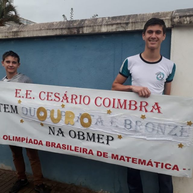 A Escola Estadual Cesário Coimbra está em festa!!!. Nesta segunda feira, 09/12/19, a Escola Cesário Coimbra saiu às ruas, em carreata, para comemorar a conquista de duas medalhas de ouro na Olimpíada Brasileira de Matemática das escolas públicas (OBMEP), edição 2019, conquistadas pelos alunos: Felipe Gabriel de Oliveira e Thiago Lohan Martinho Labanca.