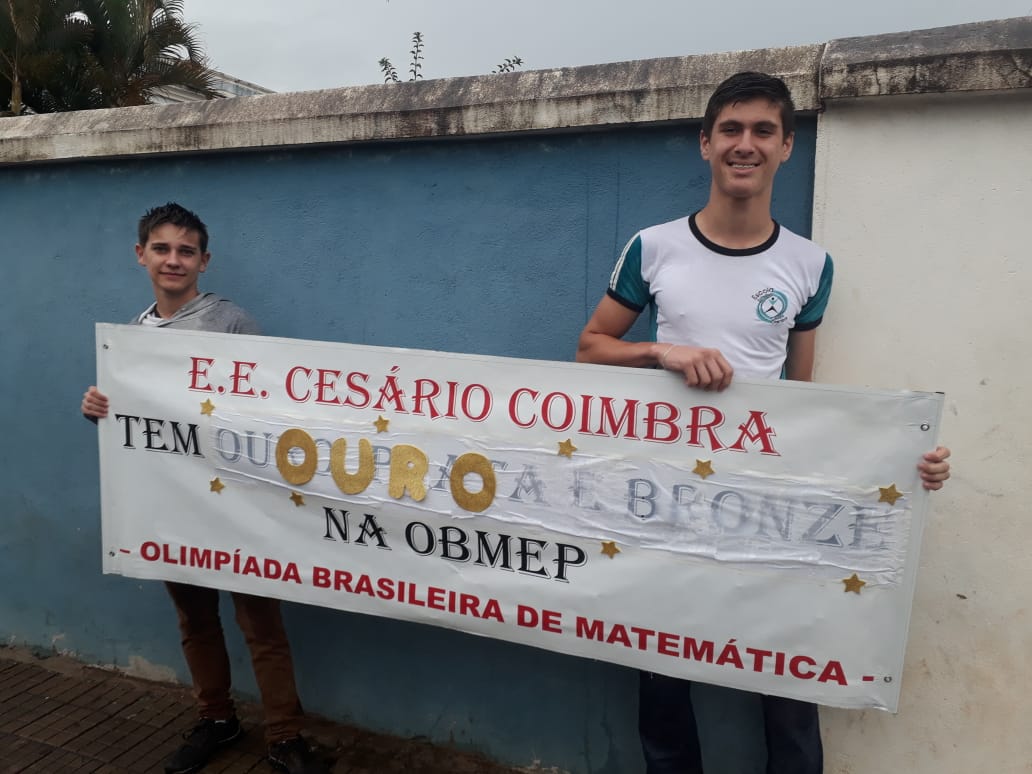 A Escola Estadual Cesário Coimbra está em festa!!!. Nesta segunda feira, 09/12/19, a Escola Cesário Coimbra saiu às ruas, em carreata, para comemorar a conquista de duas medalhas de ouro na Olimpíada Brasileira de Matemática das escolas públicas (OBMEP), edição 2019, conquistadas pelos alunos: Felipe Gabriel de Oliveira e Thiago Lohan Martinho Labanca.