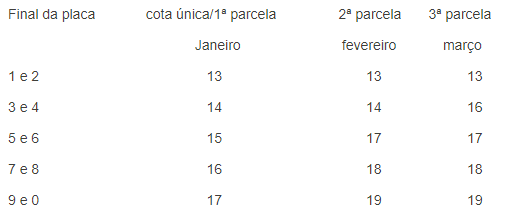 A secretaria estadual de Fazenda publicou nos últimos dias a tabela com os vencimentos do IPVA, Imposto sobre Propriedade de Veículos Automotores. De acordo com o final da placa do veículo será o vencimento do tributo. Para pagamento em parcela única, com desconto de 2,3%, o prazo será entre 13 e 17 de janeiro próximo. Já os pagamentos parcelados poderão ser feitos entre 13 de janeiro e 19 de março de 2020.