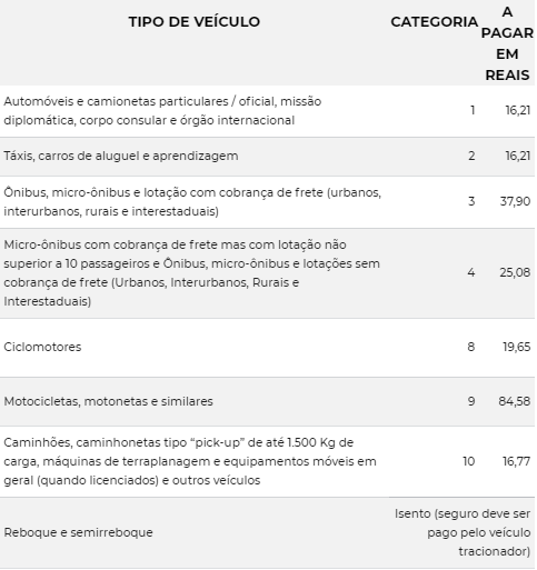Confira abaixo a tabela com os valores do seguro em cada categoria: