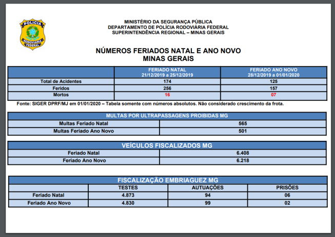 Confira abaixo os dados consolidados dos feriados de Natal e Réveillon nas rodovias federais que cortam Minas. Os números são da assessoria de comunicação da PRF: