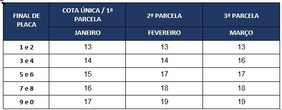 Começa na próxima segunda-feira (13/1) o vencimento do Imposto sobre a Propriedade de Veículos Automotores (IPVA) 2020, em Minas Gerais. A escala tem início com as placas de final 1 e 2 e segue sempre com dois finais de placa por dia, até a sexta-feira (17/1), se encerrando com os dígitos 9 e 0. O proprietário de veículo pode optar por pagar o imposto em cota única, com 3% de desconto, ou em até três parcelas.