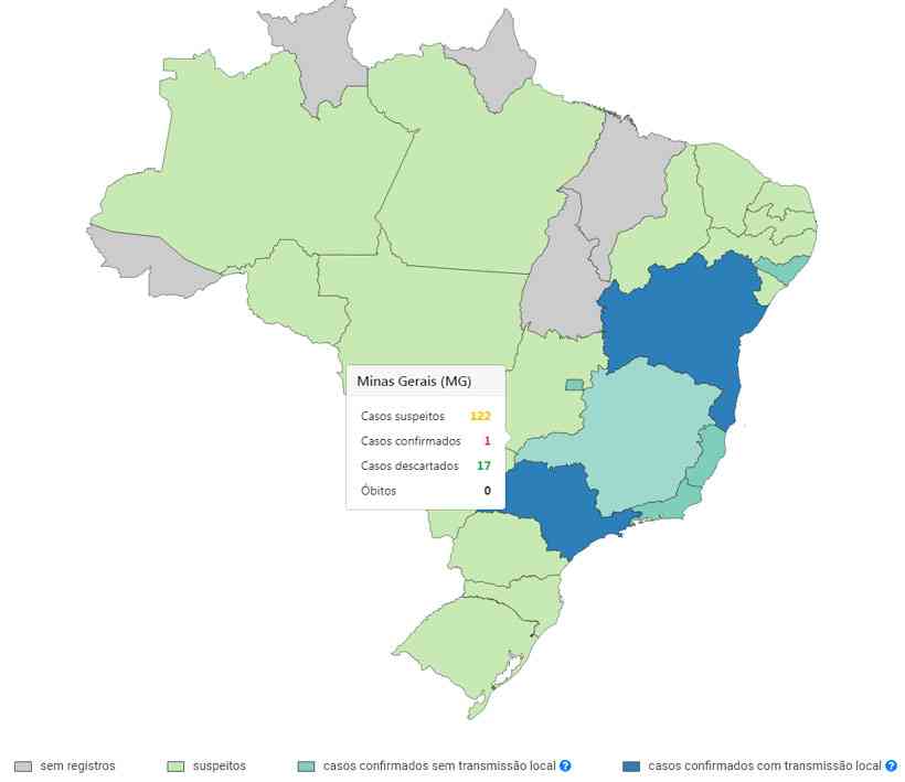 Ao todo no país há 664 casos suspeitos e 632 já foram descartados. A maior parte dos suspeitos se encontra em São Paulo (176), em Minas Gerais, no Rio de Janeiro (110) e no Rio Grande do Sul (88). O Maranhão é o único estado que não teve nenhum registro de suspeita até agora, de acordo com o ministério.