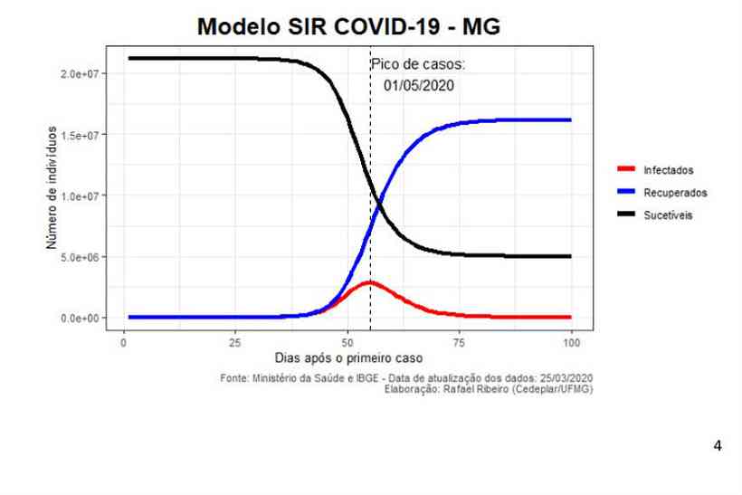 Minas Gerais pode chegar a 2,5 milhões de pessoas infectadas por coronavírus no pico do surto no estado, entre 27 de abril e 11 de maio, de acordo com estudo da Universidade Federal de Minas Gerais. Realizada pelo professor Rafael Ribeiro, da Faculdade de Ciências Econômicas (Face) da UFMG, a pesquisa estima que o número seja atingido caso nenhuma medida adicional de prevenção ao COVID-19 for tomada.
