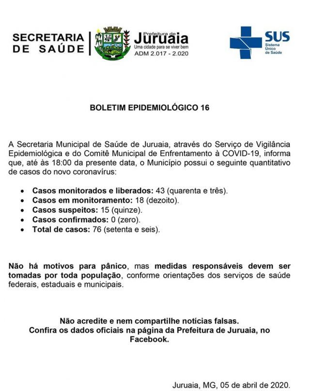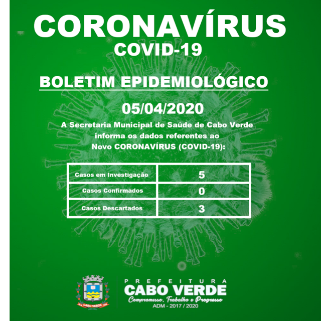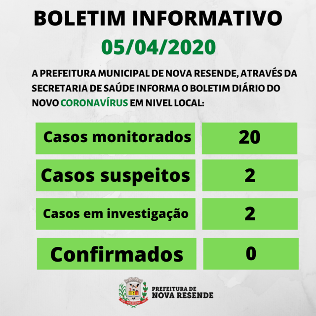 O Gabinete de Crise de Muzambinho não liberou Boletim neste domingo, 05/04/2020, os números se mantiveram os mesmos deste sábado, 04/04/20, sem nenhuma alteração.
