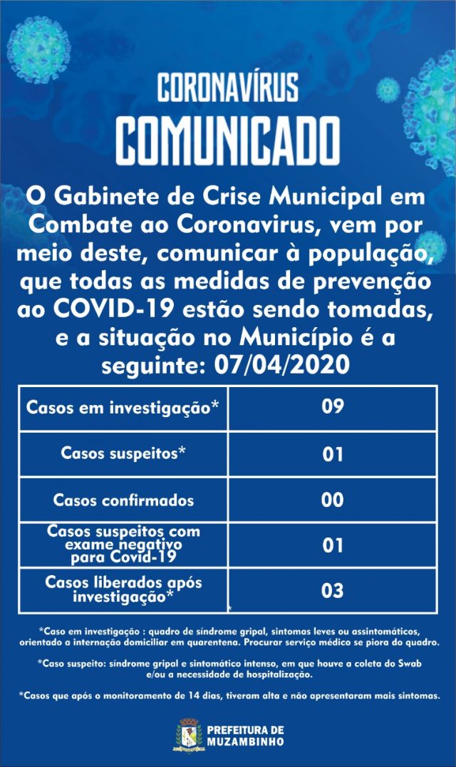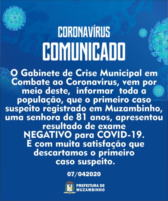 Mais Artigos DestaqueObituário Faleceu aos 87 anos o Sr. Manoel Prospero dos Reis DestaqueEsportesNossa Cidade Skatistas de Muzambinho conquistam títulos e se destacam em competição regional em São José do Rio Pardo AgronegócioDestaqueNossa Cidade Muzambinho recebe 1º Encontro Regional de Cafeicultura Sustentável em maioDestaqueNossa CidadeSaúdeCaso Suspeito teve Resultado Negativo para Covid-19 em Muzambinho… Redação7 de abril de 20201min0Gabinete de Crise soltou comunicado para tranquilizar a população muzambinhense.O Gabinete Municipal de Crise de Muzambinho recebeu o resultado do primeiro caso suspeito, e para alívio da população foi Negativo. Post Views: 900#FiqueemCasaMuzambinhoBoletimcoronavírusGabinetePrefeitura de Muzambinho