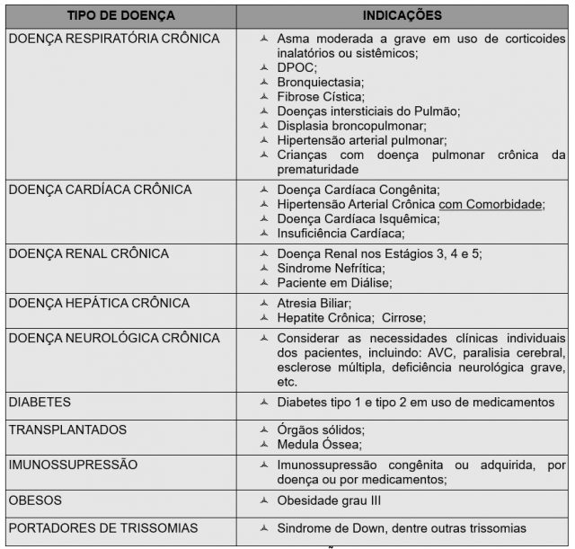 Na tabela abaixo está a relação dos grupos de doenças que dão direito a vacina contra Influenza: