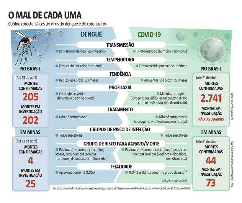 Em 2020, Minas registrou quatro mortes associadas à dengue até o último boletim, divulgado pela Secretaria de Estado de Saúde, em 13 de abril, mas outras 25 estão sob investigação. Comparativamente, as mortes por coronavírus no estado dispararam, chegando a 44 ontem, com outros 73 em investigação. Estudo da Organização das Nações Unidas concluiu que a taxa de letalidade entre infectados pela COVID-19 fica entre 0,04% a 11% (com taxa superior no grupo de risco). A literatura médica aponta que o índice de mortalidade por dengue é de 0,05%.