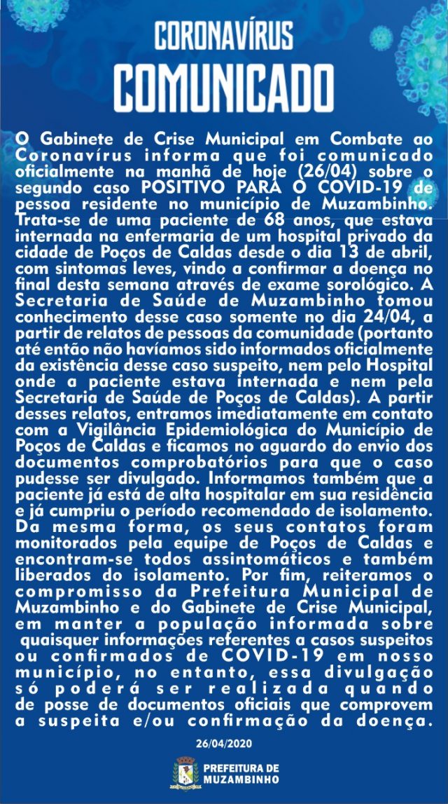 Prefeitura confirma 2º Caso Positivo de Covid-19 em Muzambinho…