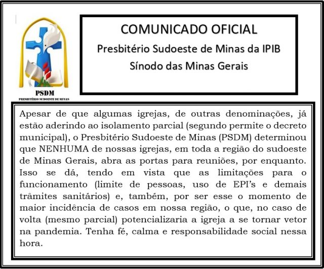 Mais Artigos Saúde Caso confirmado de sarampo acende alerta sobre cobertura vacinal Saúde Quando começa a vacinação contra a gripe nos postos de saúde em 2026? Saúde 7 hábitos e posturas que prejudicam sua coluna lombarReligiãoSaúdeComunicado do Presbitério Sudoeste de Minas da IPIB Redação2 de maio de 20201min0Presbitério decide não retornar aos Cultos presenciais, mesmo com decretos favoráveis.Igreja Presbiteriana Independente do Brasil Post Views: 1.383CultosIgrejapresbiterianaPresbitério
