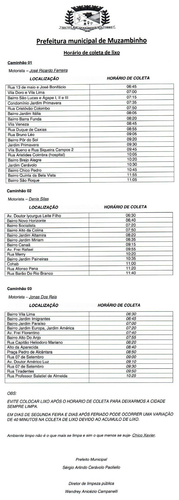 Mais Artigos EconomiaPolítica Governo do Brasil define calendário de pagamentos do Bolsa Família para 2026 DestaqueNosso EstadoPrevisão do Tempo Quase 300 cidades mineiras estão em alerta para onda de calor; Muzambinho está na lista DestaqueObituário Faleceu aos 64 anos o Sr. Helder Nilo GasparDestaqueNossa CidadePolíticaPrefeitura Alerta População para os Horários da Coleta de Lixo em Muzambinho. Redação6 de maio de 20201min0Favor não colocar o lixo na porta de sua casa, fora do horário. Post Views: 956caminhãoColetaColeta de LixoLixo