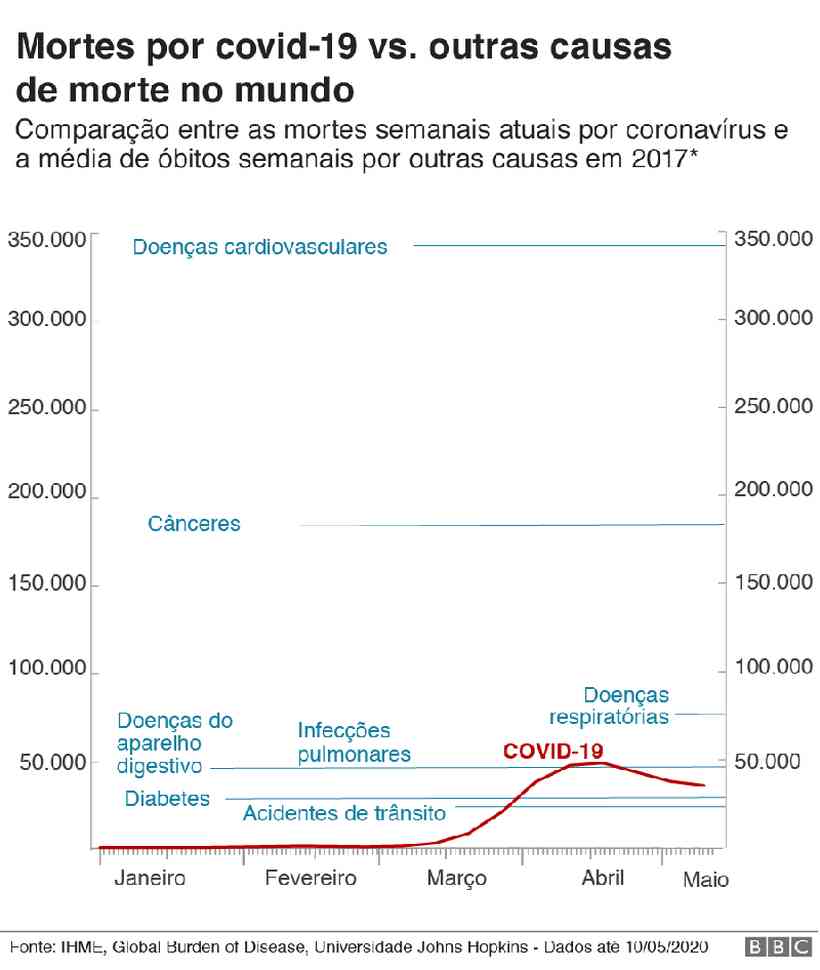 Mesmo assim, no pico entre meados de março e abril, ele superou a média de mortes semanais causadas em 2017 por diabetes, acidentes de trânsito e doenças do aparelho digestivo em todo o mundo, deixando também para trás problemas como tuberculose, HIV e malária.