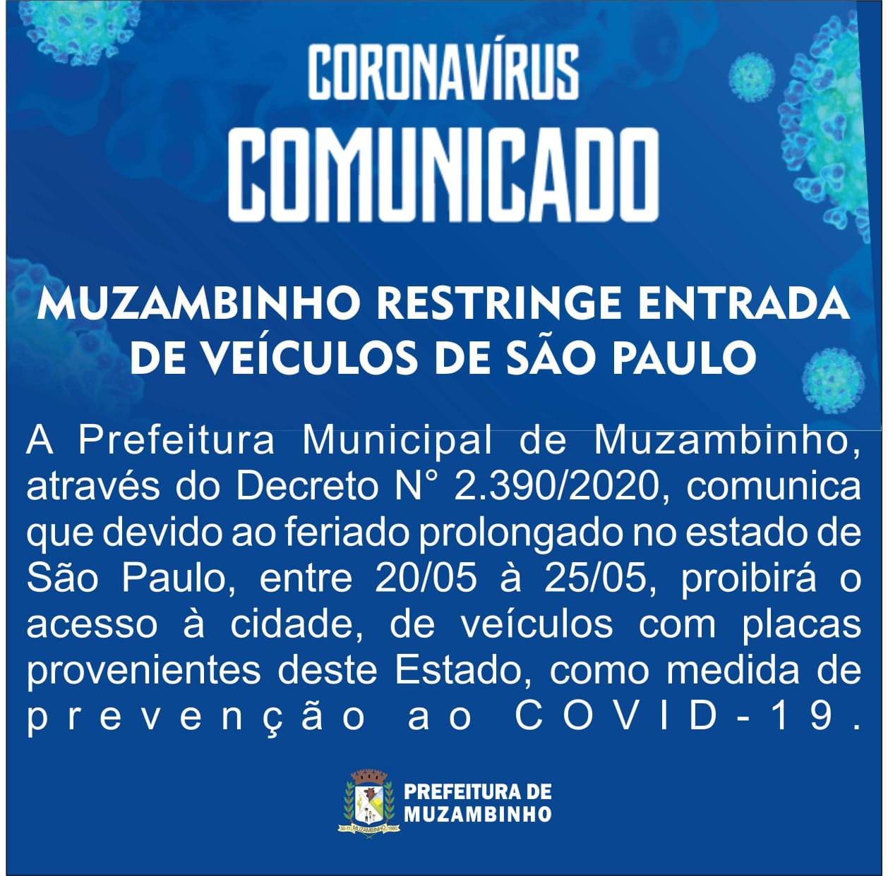 Devido ao Feriado antecipado e prolongado em São Paulo, o acesso de veículos com placas do estado de São Paulo será proibidos entre os dias 20 a 25/05/2020.