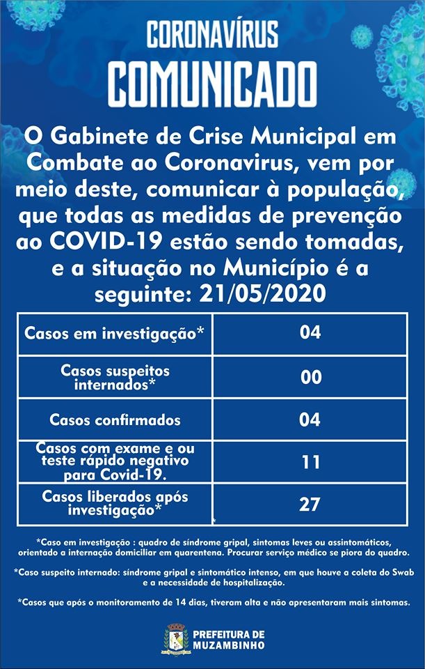 O Gabinete de crise municipal em combate ao coronavírus comunica que a situação da cidade até esta quinta-feira, 21/05/2020, é a seguinte: