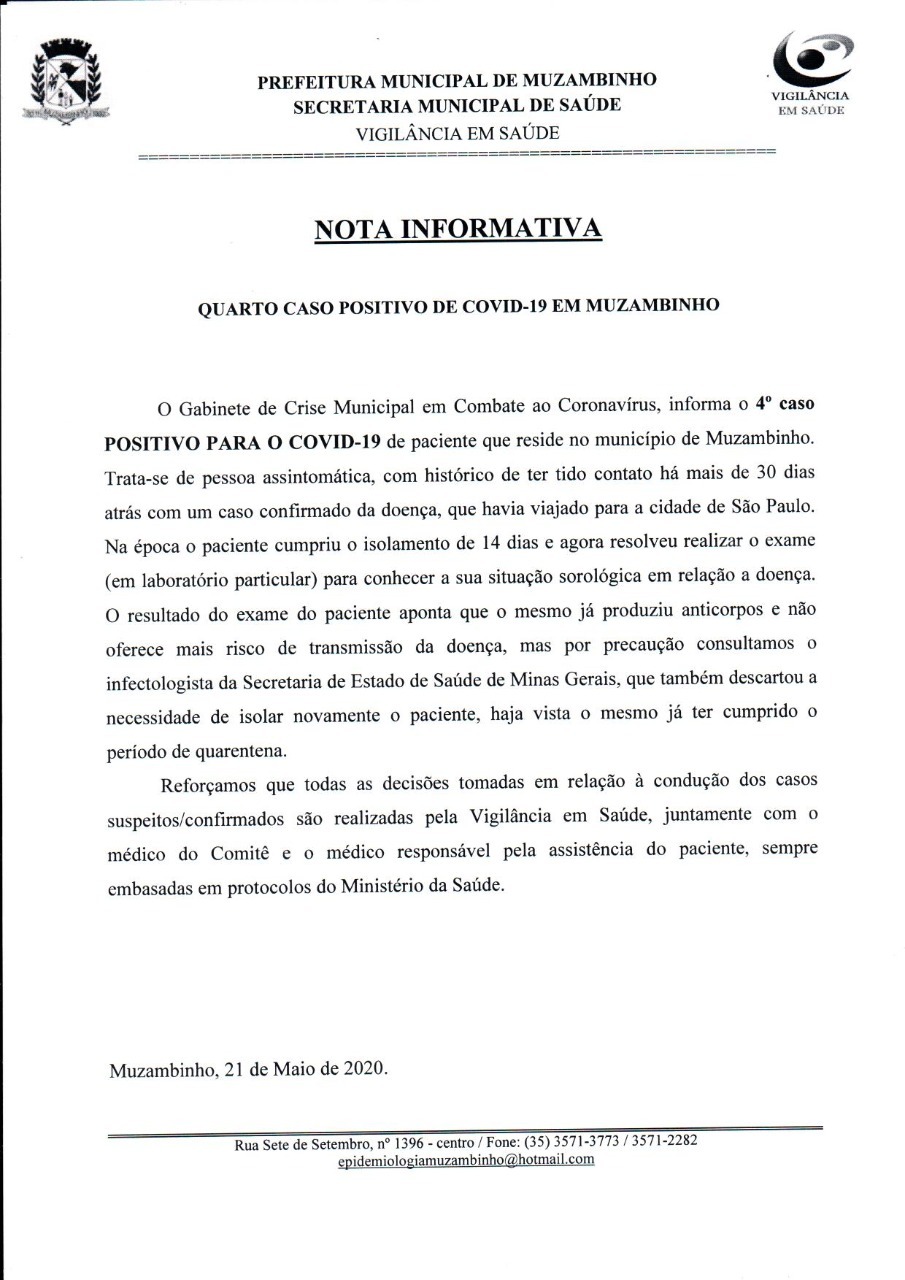 Confira a baixo a Nota Informativa da Prefeitura de Muzambinho: