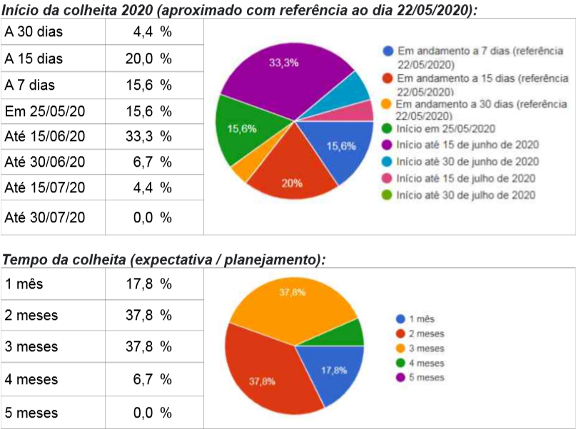 Observamos pelas respostas que 84,5% dos cafeicultores iniciaram ou pretendem iniciar suas colheitas entre 15 de maio e 15 de junho de 2020 e que a esmagadora maioria (93,4%) planeja colher sua safra em até 3 meses de trabalho.