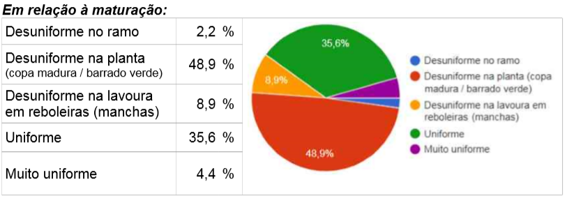 Podemos interpretar que a expectativa de maturação bastante uniforme propiciará oportunidade de cafés de alta qualidade. Evidencia também que devido às tecnologias de produção utilizadas atualmente, que provocam alto sombreamento parcial das plantas (espaçamento mais adensado nas linhas, manutenção do enfolhamento mesmo em altas produções, etc.), destaca a desuniformidade da maturação dos frutos nas plantas, justificando a indicação da colheita ao menos semi seletiva, facilitada nas propriedades que utilizam a colheita mecanizada com máquinas montadas. Naquelas que utilizam colheita manual ou mecanizada por derriçadoras portáteis, a viabilidade e estratégia deve ser tratada caso a caso. Além dos custos diretos, há de se avaliar rendimento (litros na colheita / saca), percentual de grãos de alta qualidade, maior tempo para realizar a colheita, antecipando o inicio e prolongando seu final, maximizando o uso de infraestrutura e da mão de obra, destacadamente a familiar.
