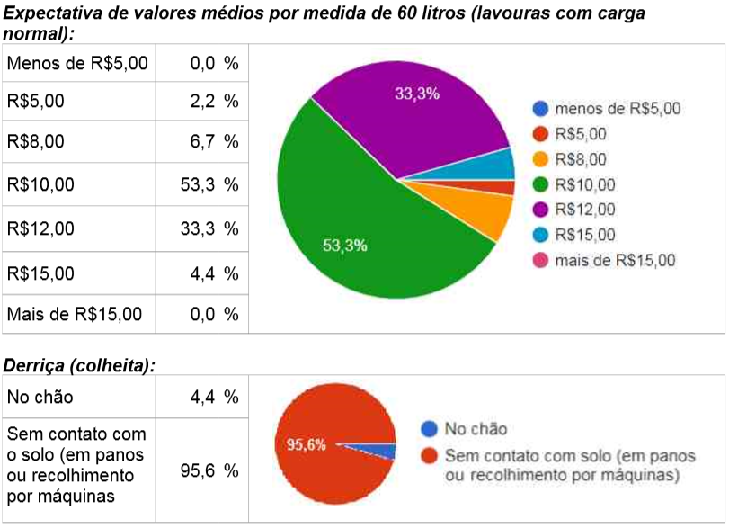 No bloco anterior observamos que a maioria dos produtores (86,6%) esperam manter o custo por medida entre 10 e 12 reais, valores que já vem sendo praticados em safras anteriores. Pequena porcentagem espera colher a R$5,00 a medida, provavelmente nas propriedades que realizam toda a colheita e varrição mecanizada (derriça por máquinas montadas, enleiramento, recolhimento e abanação do café do chão totalmente mecanizados). A safra é colhida em panos ou máquinas, 95,6%, sem contato com o solo, evidenciando o cuidado com a qualidade e segurança alimentar da produção.