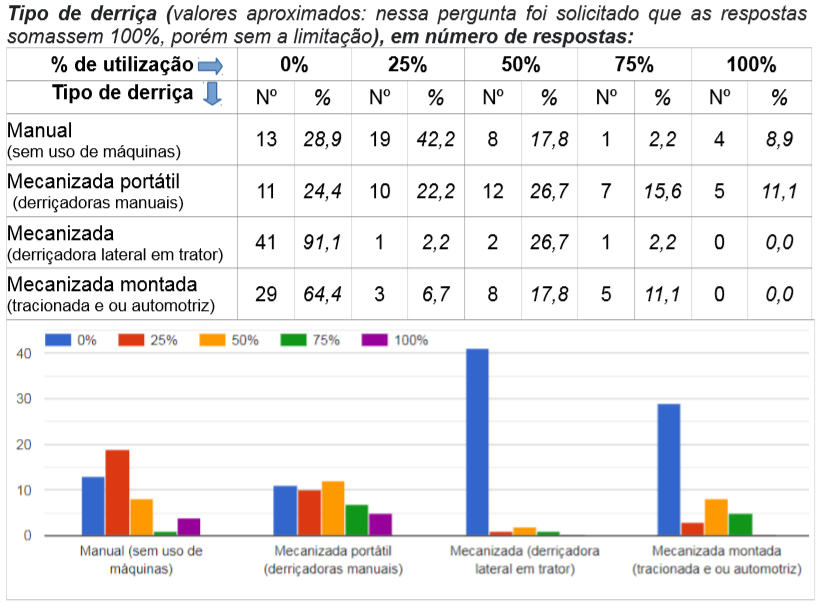 Em relação ao tipo de colheita conclui-se que serão utilizadas praticamente todas as opções disponíveis, sendo a derriçadora lateral tratorizada com baixíssima ocorrência, pois não será opção para 91,1% dos produtores. Há também a diminuição progressiva da colheita estritamente manual, porém presente em até 50% do volume em 71,1% das propriedades, provavelmente focadas nas lavouras novas, primeira safra pós poda ou baixa carga pendente. As derriçadoras portáteis estarão presentes em de 75% das propriedades, sendo que para 11,1% serão responsáveis por 100% da colheita. As colhedoras montadas, sejam tracionadas por trator ou automotrizes devem ser utilizadas em 35,6% das propriedades, porém em nenhuma será responsável por 100% da derriça dos grãos nesta safra, mas 11,1% das propriedades pretendem colher até 75% do volume com essas máquinas, cada vez mais acessíveis aos diversos tamanhos de propriedades pela locação facilitada, ficando como restrição ao seu uso a topografia e ou falta de adequação das lavouras.