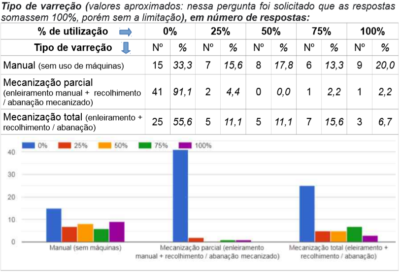 A varrição e levante dos frutos caídos é feita de maneira 100% manual por 20% dos entrevistados, sendo que há a possibilidade daqueles que relatam percentuais menores na forma manual estarem considerando o uso de máquinas portáteis como sopradores, entre outros, visto que esta situação não foi contemplada no questionário. A total mecanização da varreção será utilizada em apenas 6,7% das propriedades. Com a popularização desses equipamentos, quase a metade, 44,4% dos entrevistados, devem utilizar a mecanização da varrição em partes das suas lavouras. Apesar do custo para aquisição, mesmo com a possibilidade de locação, cada vez mais acessível, a adoção generalizada demorará, principalmente pelos motivos citados acima (relevo e adequação de lavouras).